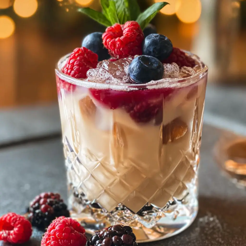 2 ounces premium vodka, high-quality for smooth finish 1 ounce coffee liqueur, Kahlua or similar brand preferred 1 ounce heavy cream, cold for optimal texture 1/2 cup mixed fresh berries, strawberries, raspberries, or blackberries 2 tablespoons berry syrup, homemade or store-bought 1/2 teaspoon vanilla extract, pure variety for enhanced flavor Ice cubes, large format for slower dilution Fresh berries for garnish, whole and attractive for presentation Whipped cream, optional for luxurious topping Mint sprig, for aromatic finishing touch