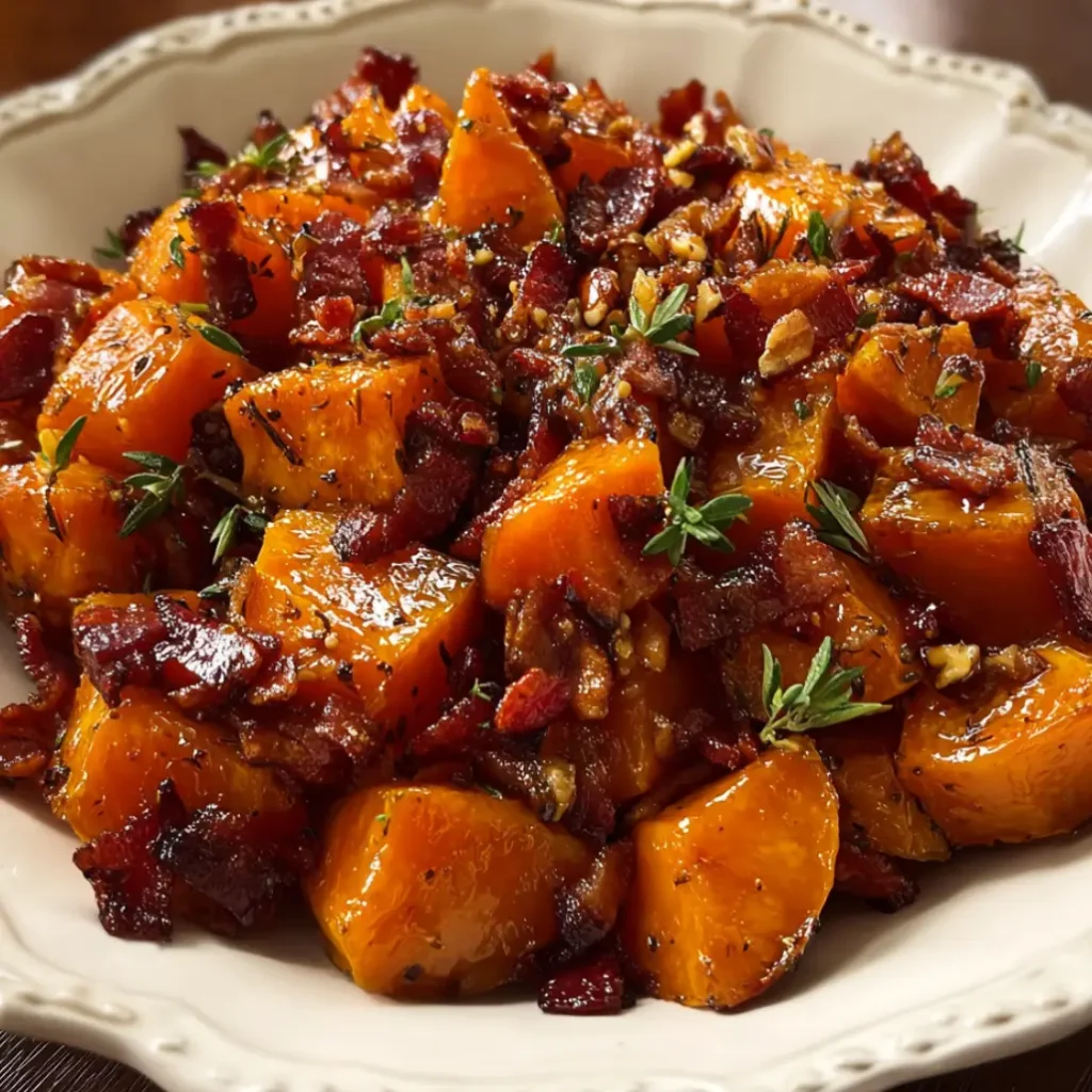 Key Points: Sprinkle the crispy bacon pieces evenly over the glazed yams because this ensures every serving contains the perfect balance of sweet and savory elements.
