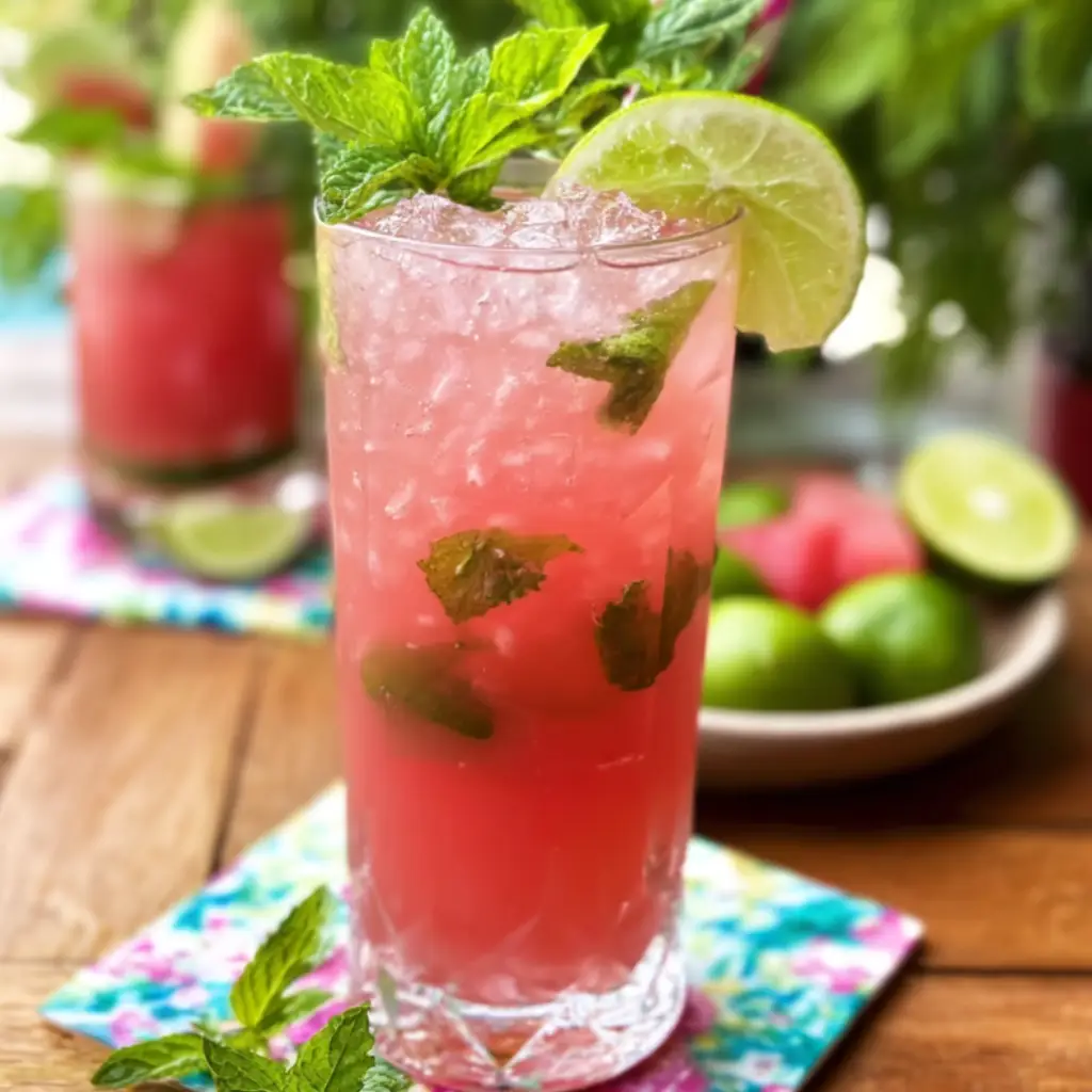 Fill serving glasses with ice cubes, then pour the strained watermelon mint mixture over the ice, filling glasses about two-thirds full before topping with chilled sparkling water because this layering technique maintains effervescence while ensuring proper dilution and temperature control. Garnish each glass with fresh mint sprigs, lime wedges, and watermelon pieces, then serve immediately while the carbonation is at its peak for optimal drinking pleasure.